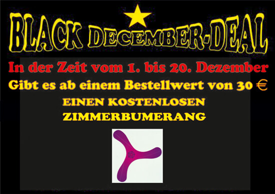 Beim Bumerang-Projekt gibt es nicht nur Black Friday Deals! Nein den ganzen Dezember über - bis einschließlich Heiligabend - ist bei uns Black Friday! Durchgehend, täglich, inklusive der Wochenenden!